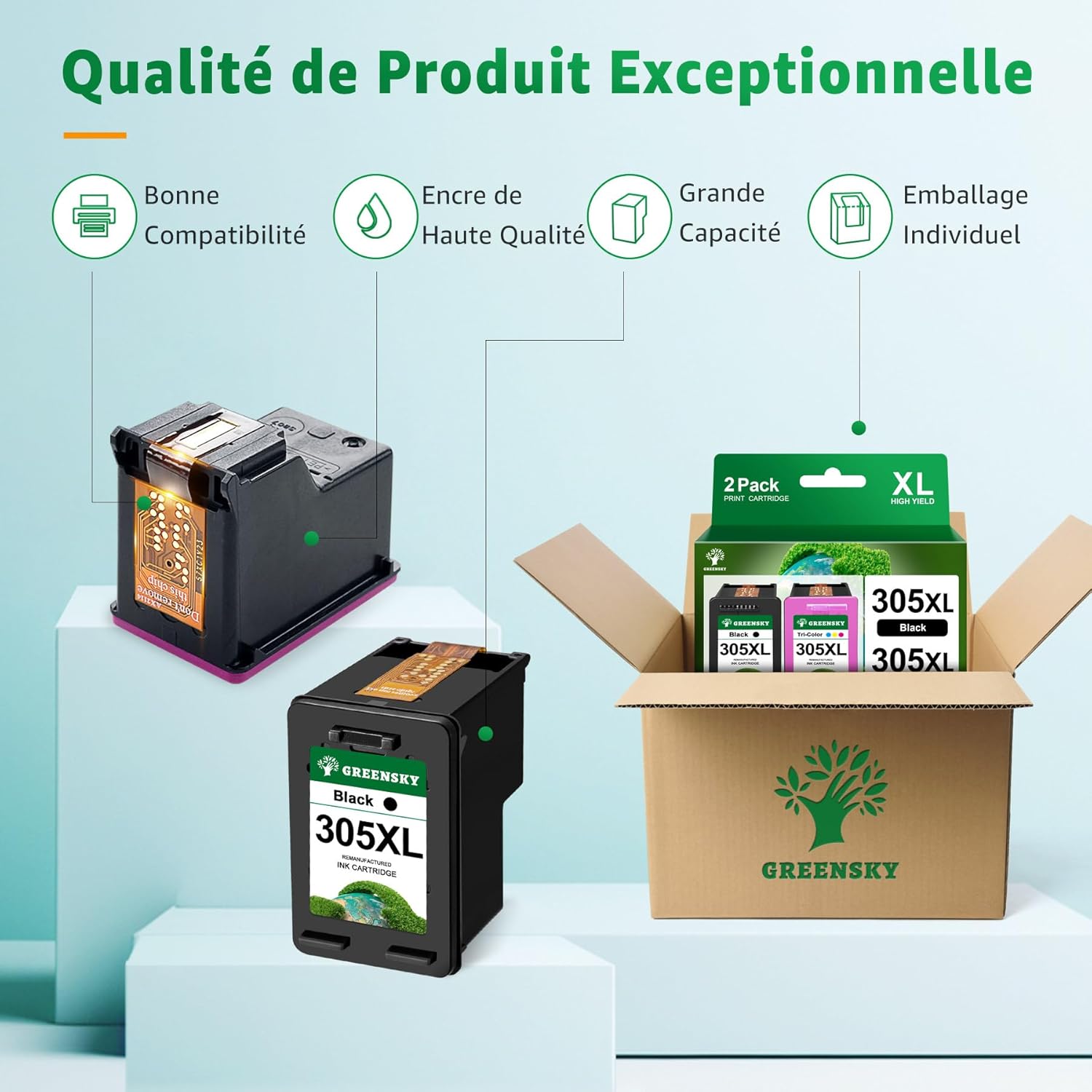 Contenu du coffret : GREENSKY 305XL multipack, chaque coffret contient 1 x 305XL Noir et 1 x 305XL Couleur, 1 x Manuel d’utilisation du produit