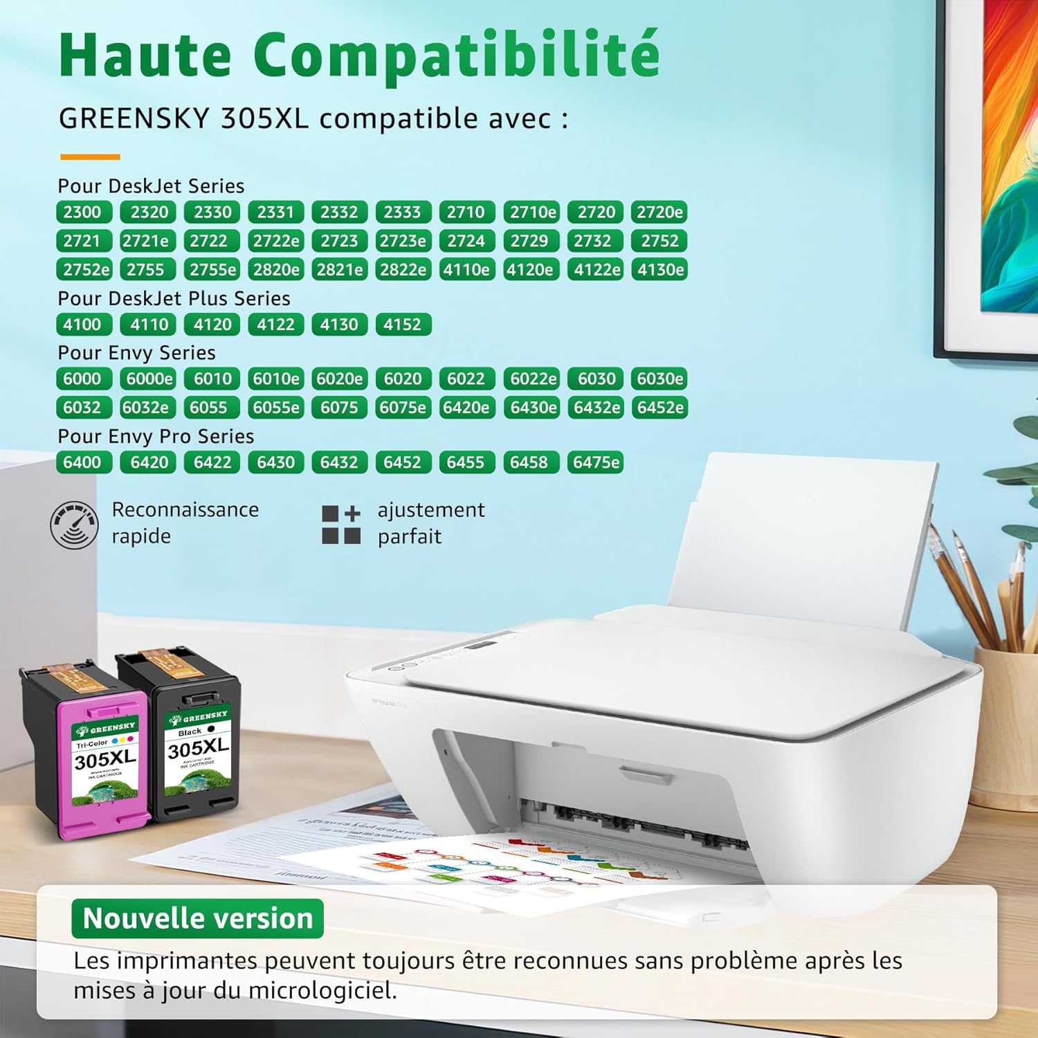 Excellente compatibilité: GREENSKY 305XL compatible pour encre HP 305 XL equipées de la dernière puce, elles garantissent une reconnaissance parfaite et une utilisation stable et durable de votre imprimante. Compatible avec HP DeskJet 2720e 2720 2722 2722e 2723e Envy 6020 6020e 6022 6022e 6032e 6432e (voir la page de détails ci-dessous pour la liste complète des modèles compatibles)
