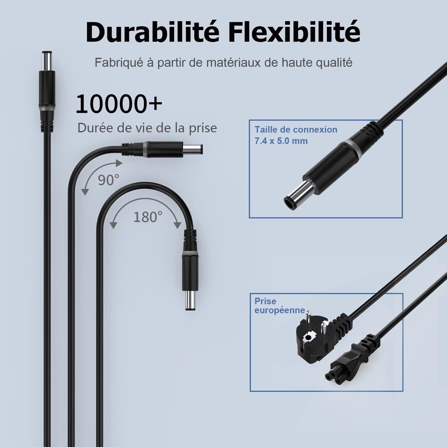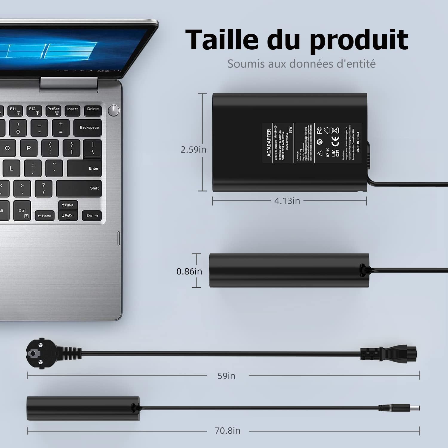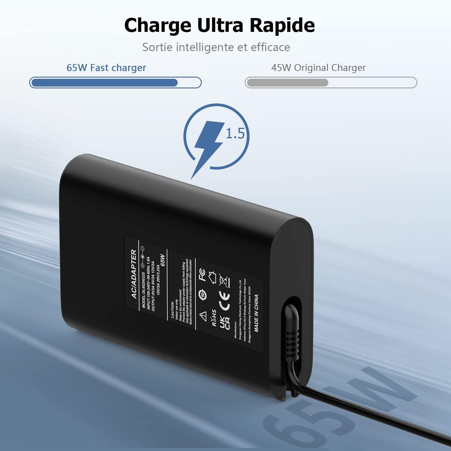 【Chargeur Dell 65W】Entrée: 100-240V~1,5A 50/60Hz; Sortie: 19,5V 3,34A 65W; Taille du connecteur: Ø 7,4 x 5,0mm. Contenu de l’emballage: 1 x Chargeur PC Dell, 1 x Câble d’Alimentation EU, 1 x Manuel d’Instructions.
