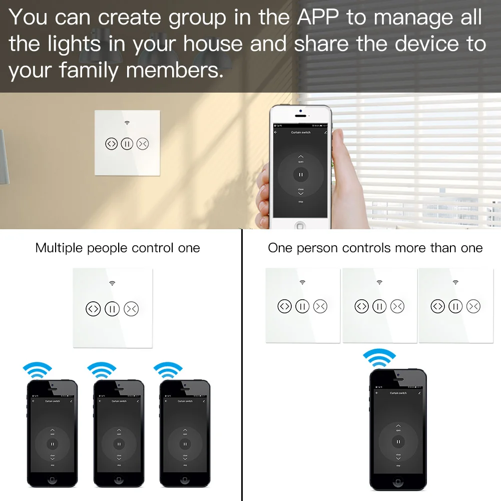 1.Easily transform your house into a smart one with the new powerful functional smart curtain switch;2/3-way multi-control association to control 1 roller blinds,shutter curtain with multiple curtain switches;Intelligently control our roller blinds,shutter curtains in a much easier way with multiple controlling modes;RF remote and manual control your curtains optional and available meanwhile with RF frequency built in,so as group control multiple switches with one Remote switch;achieve multi-control by associating to other smart switches;can work with smart curtain motor for roller shutter/blinds to realize automation for all curtains at home;add motorized shades or other similar devices to your smart home with Smart Curtain Motor!(Note:the curtain motor is not included in the package,you need a self-purchase of it;RF remote control switch is included in the package.)