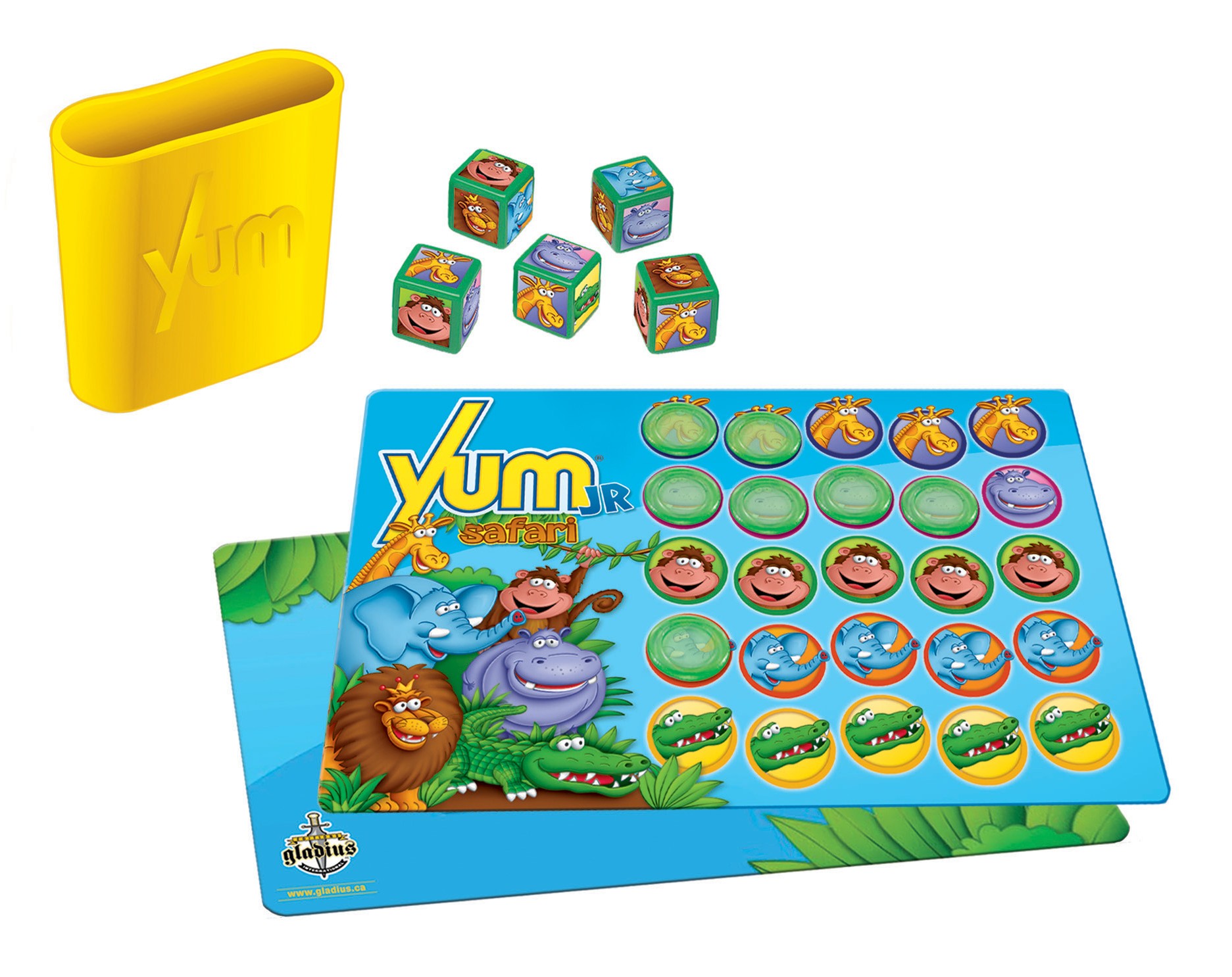 Yum Jr Safari. Lancez les dés pour obtenir le plus de personnages identiques et déposez le nombre de jetons correspondants sur votre carte.